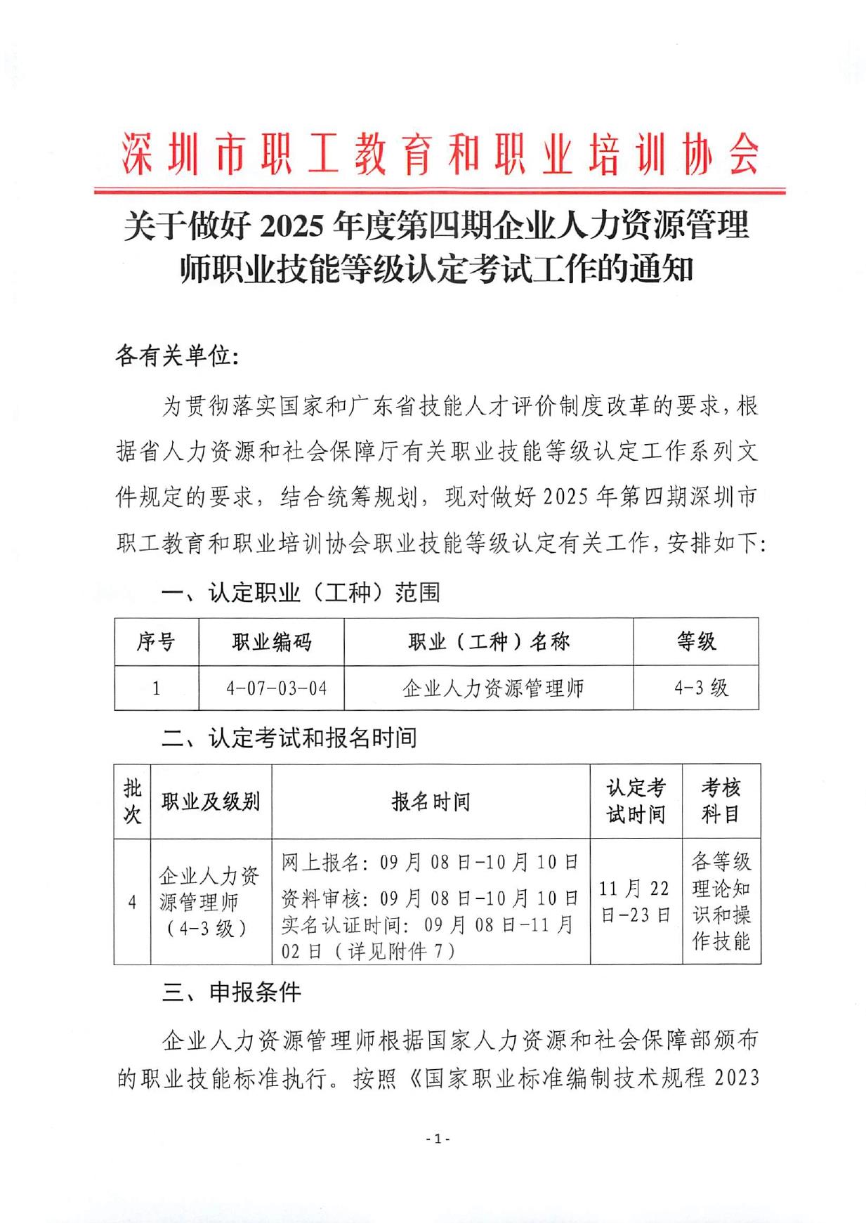 关于做好2025年度第四期企业人力资源管理师职业技能等级认定考试工作的通知
