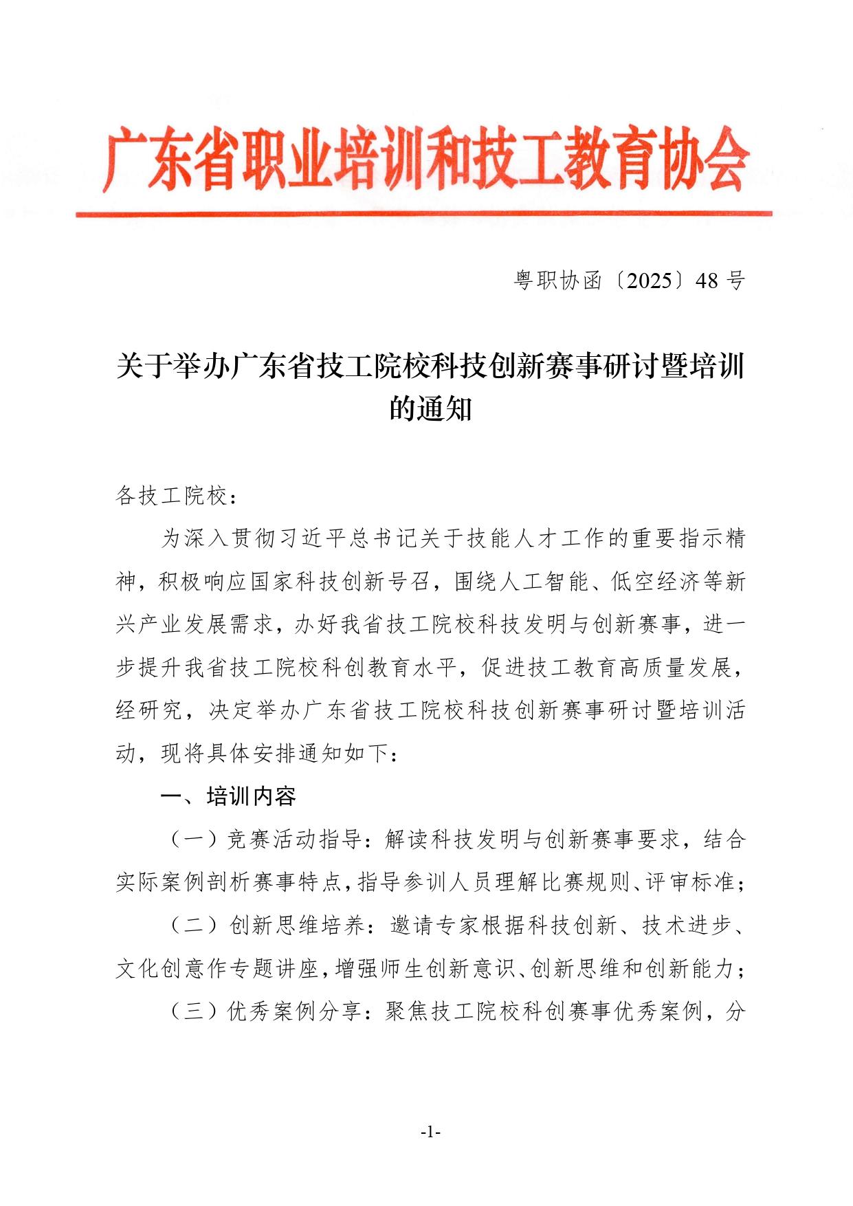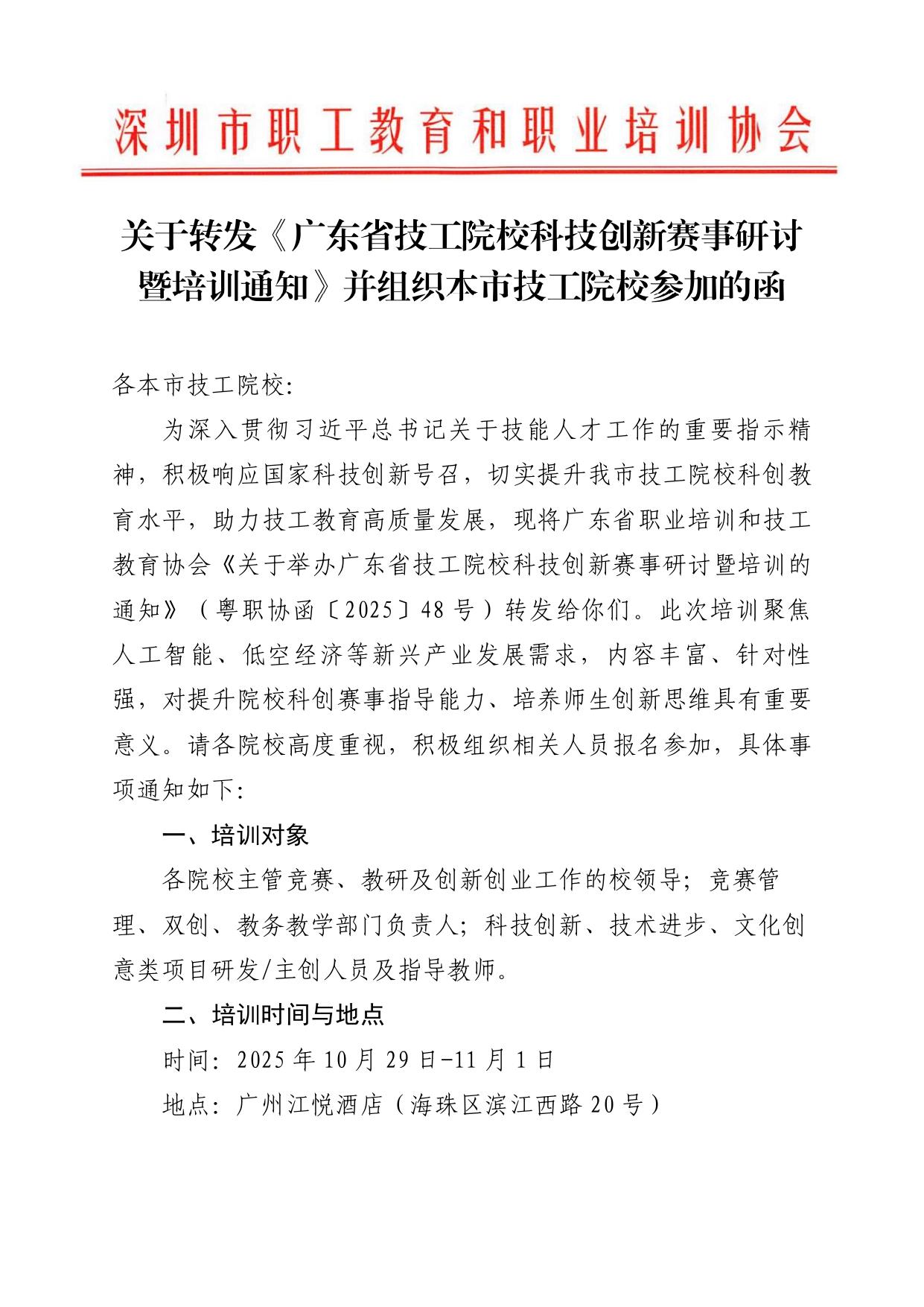 关于转发《广东省技工院校科技创新赛事研讨暨培训通知》并组织本市技工院校参加的函