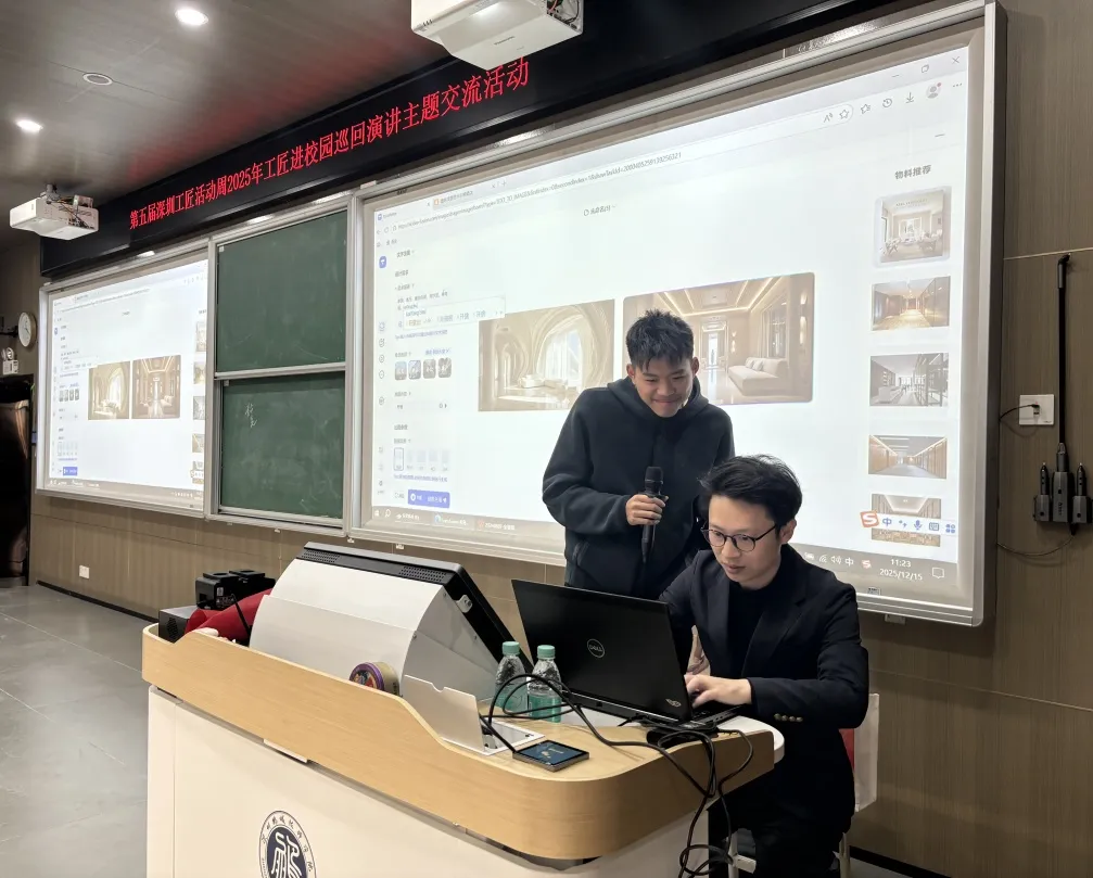 在技艺展示环节,郑开峰大师现场演示了利用人工智能技术快速生成建筑效果图的过程,直观呈现了科技赋能下创意实现的惊人效率。随后进行的互动实践环节气氛热烈,学生们踊跃上台体验、积极提问,郑开峰一一给予细致解答和指导,鼓励同学们夯实专业基础、勇于创新探索。