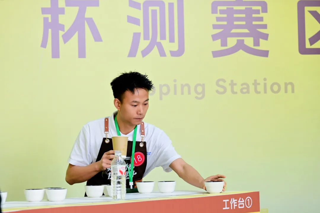 咖啡杯测采用标准化三角杯测模式,现场设置8组测试样本,每组3杯咖啡中均有1杯存在风味差异。选手需在规定时间内找出不一样的一杯。杯测现场,选手们神情专注,端起咖啡浅尝,凭借感官与经验捕捉风味差异,裁判现场即时核对答案,赛场紧张感拉满。
