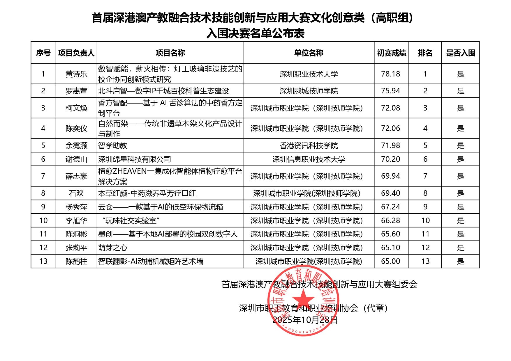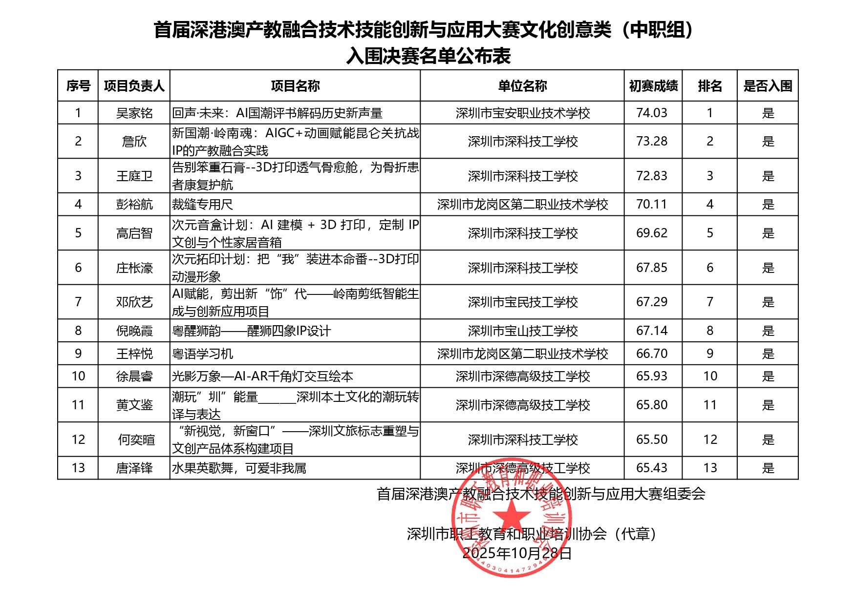 首届深港澳产教融合技术技能创新与应用大赛(文化创意类)入围决赛名单公布表