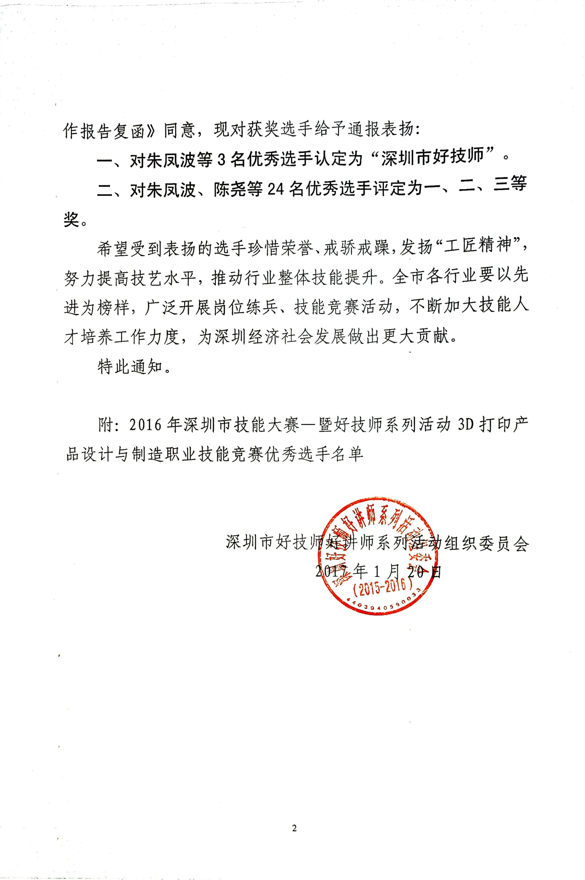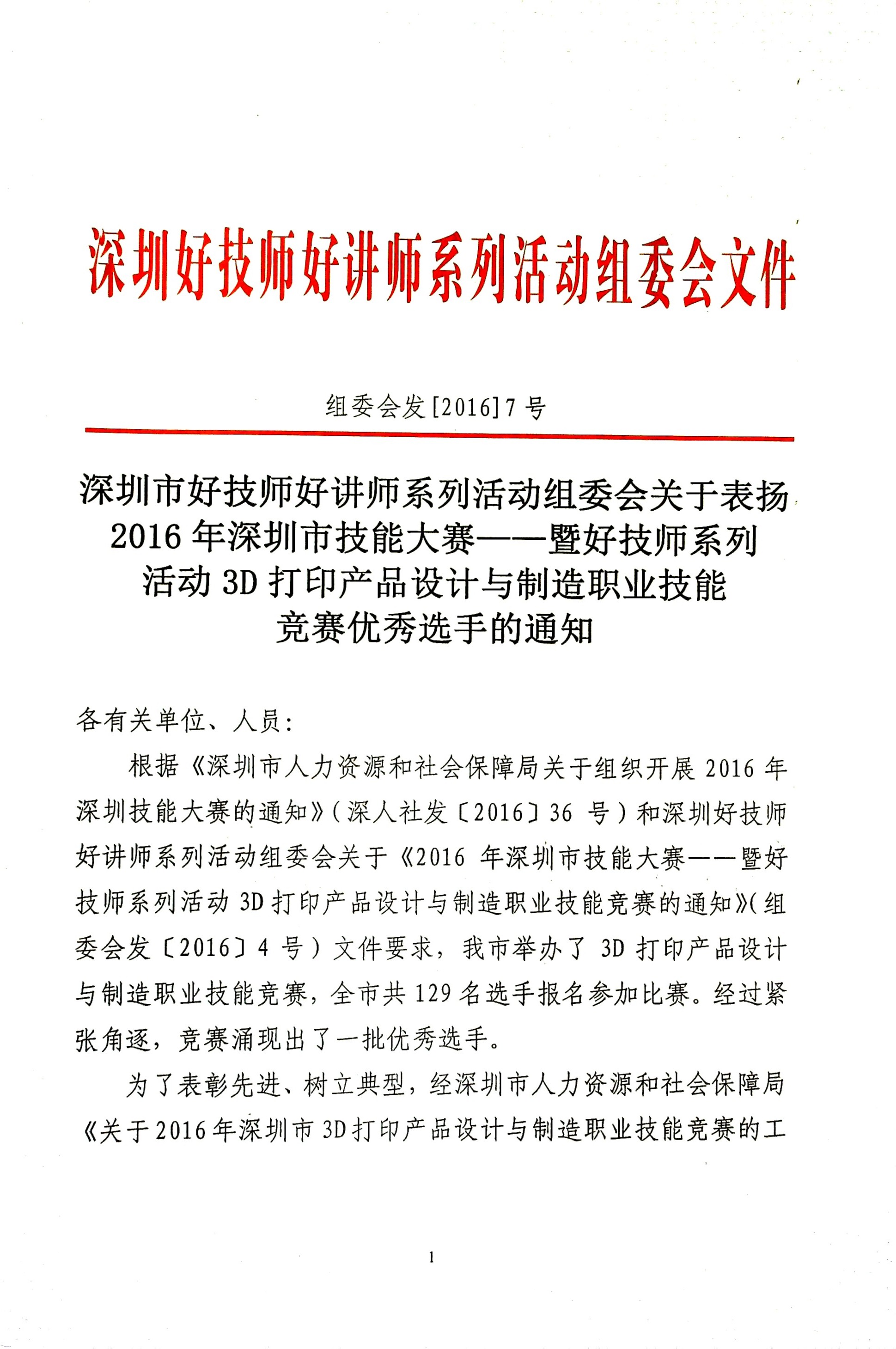 深圳市好技师好讲师系列活动组委会关于表扬2016年深圳市技能大赛--暨好技师系列活动3D打印产品设计与制造职业技能竞赛优秀选手的通知