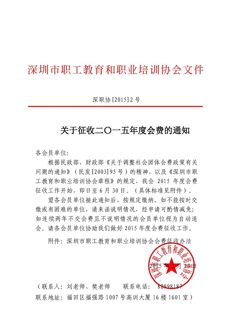 关于征收二〇一五年度会费的通知